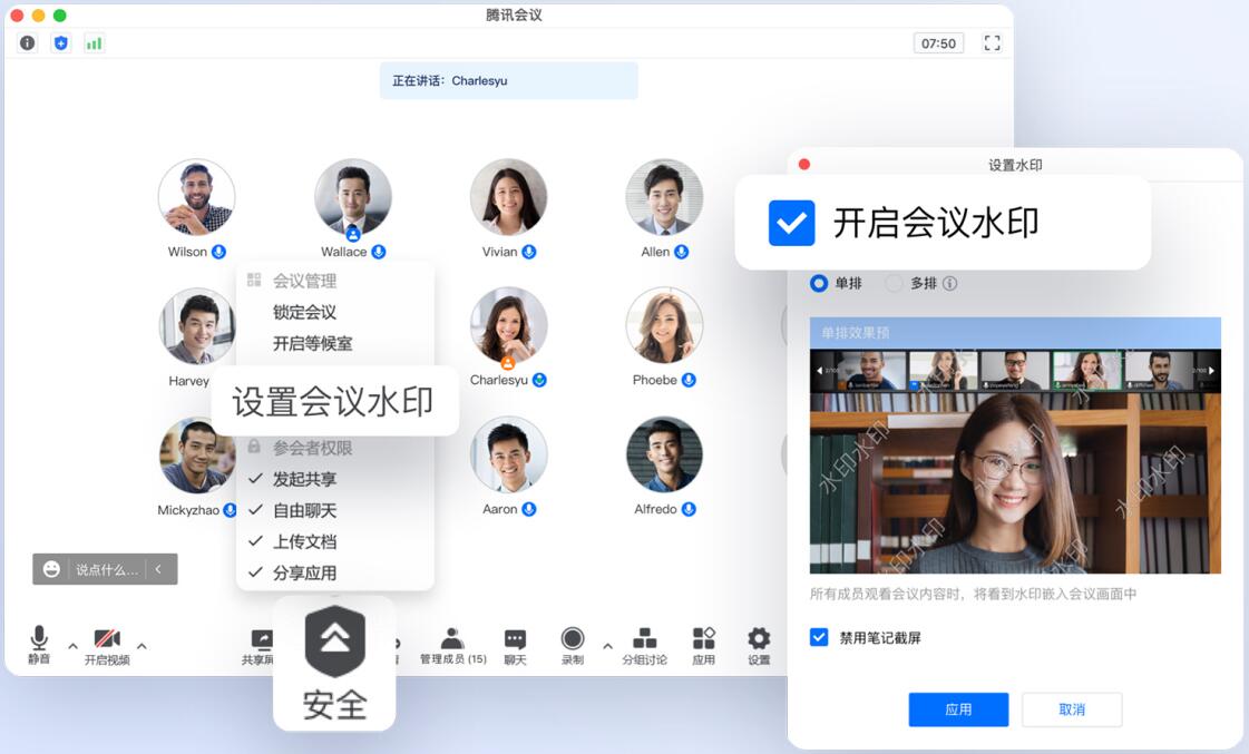 ? ? ? ?3、支持全局水印,覆盖会议主界面、会议悬浮窗、本地录制文件等所有会议场景,确?;嵋槟谌莅踩抻?。