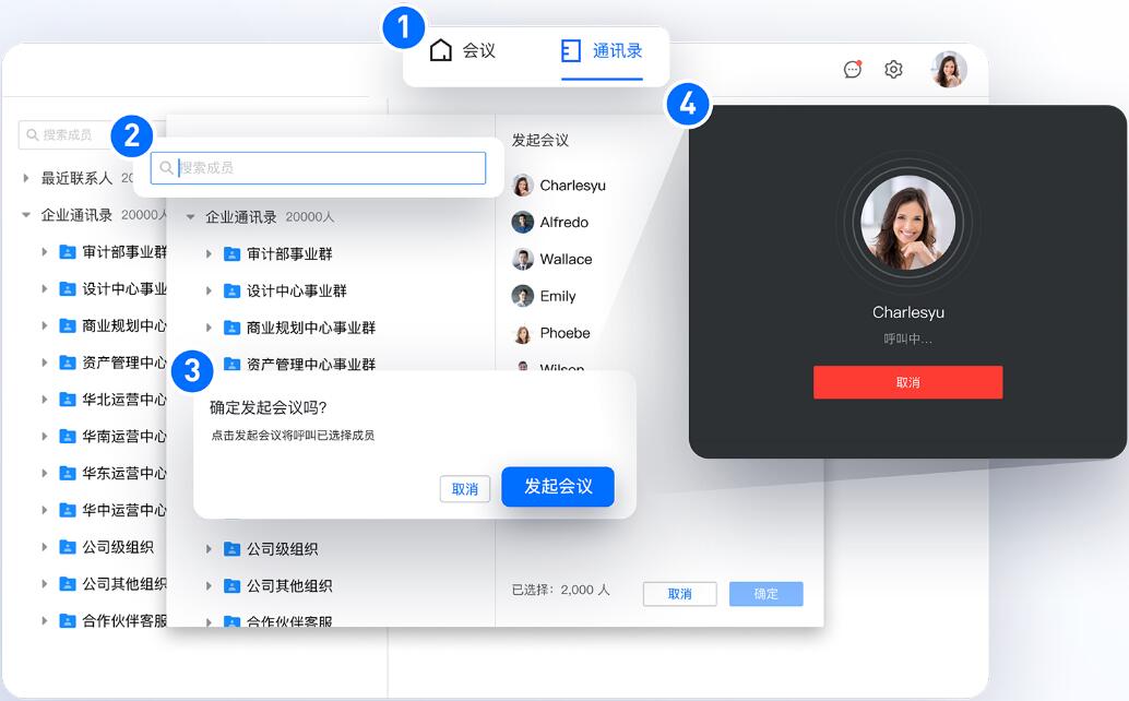 ?? ? ? 1、通讯录批量邀请,会前消息通知,客户端响铃呼叫功能,让参会者及时收到会议提醒快速入会。