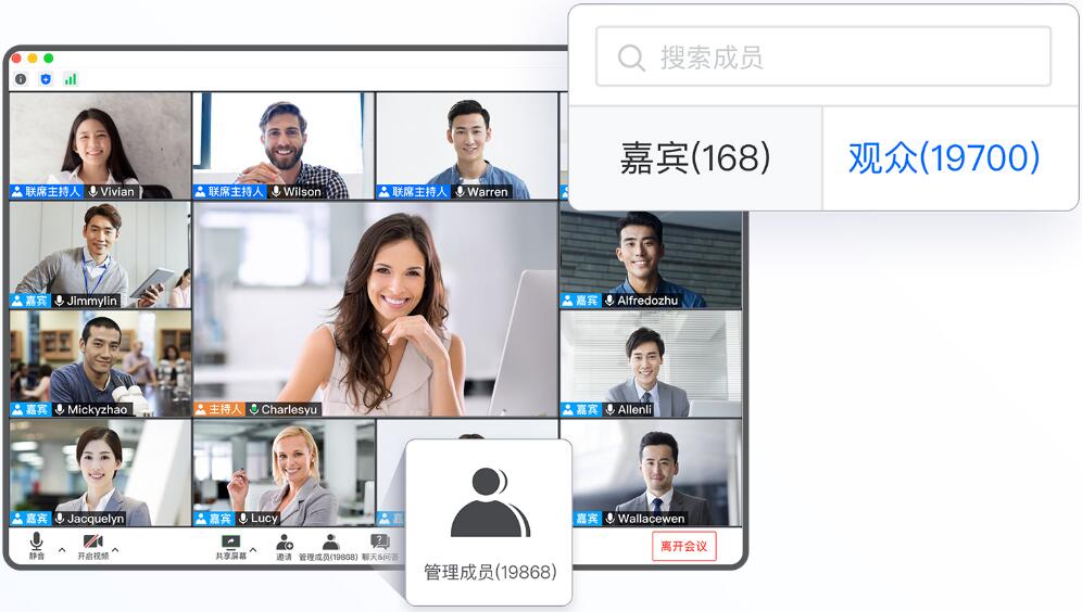 ? ? ? ?1、支持500、1000、2000方的大房间,2万方网络研讨会(Webinar),满足客户大规?;嵋?/span>需求。