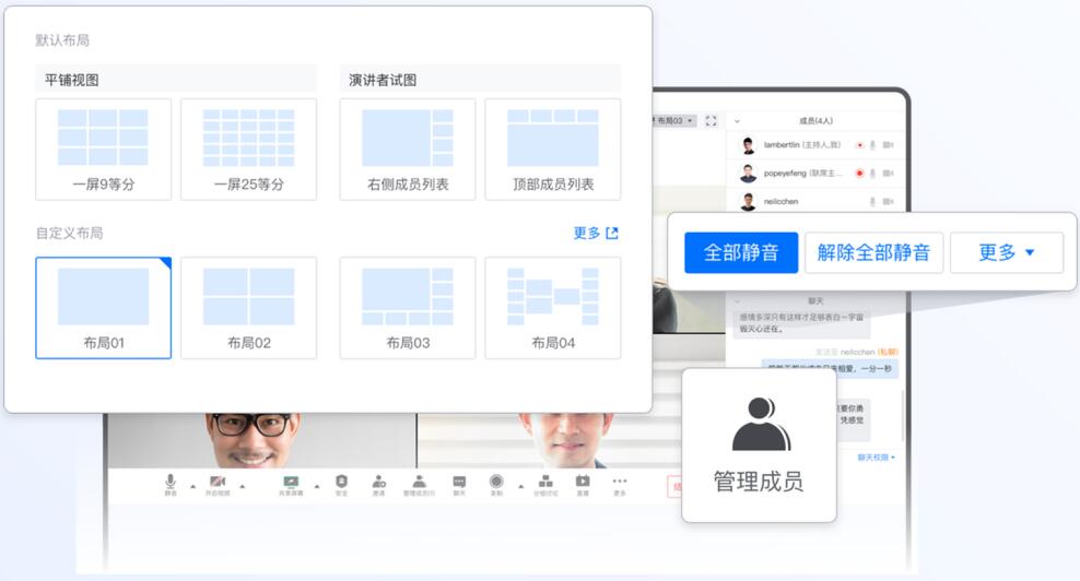 ? ? ? ?2、企业版用户专享自定义会议布局,“自定义会议布局”,多种模式随心切换,不同场景有序展示。
