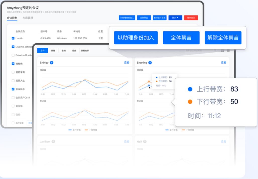 ? ? ? ?支持企业管理后台,可进行分级分权、会议管理、资源管理、数据统计、质量监控、场外会议控制、自定义布局等,满足用户管理需求。
