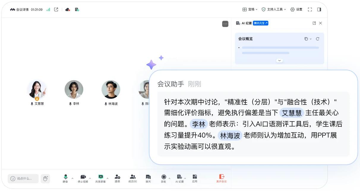 AI智能提炼总结会议结论与待办,并根据当前讨论实时刷新。决策要点、任务分配、关键节点清晰呈现,帮助参会人随时掌握会议成果?;怪С质凳笔侗?,并高亮标注发言人?;嶂兄氐阋荒苛巳唬岷笾霸鹈魅?,执行高效。