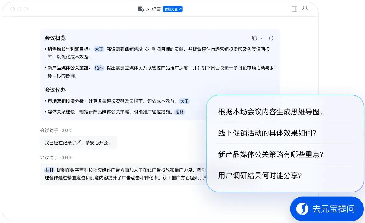支持AI纪要一键导入腾讯元宝,基于AI纪要内容继续为您答疑解惑,梳理逻辑链条,联网搜索相关信息,生成行动计划等等。让会议洞见进一步转化,发挥更大价值。