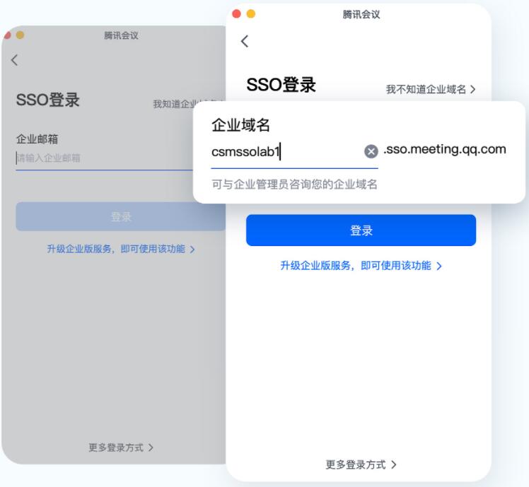◎ 您可将腾讯会议对接到已有的组织/企业账户认证体系中,通过SSO,输入企业域名或企业邮箱,即可登录腾讯会议。