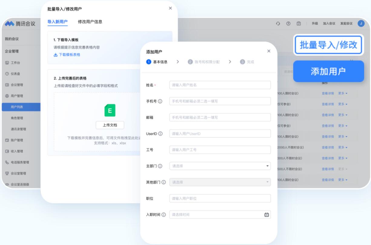 通过电脑端访问腾讯会议官网,点击【个人头像】-【企业管理】-【用户管理】,您可以下载模版进行批量导入,也可以逐个添加企业成员。