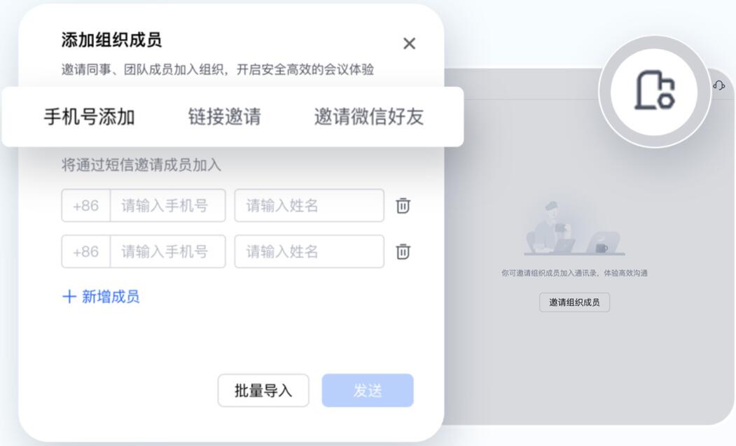 ◎ 腾讯会议APP也为您提供组织管理能力,前往【通讯录】,点击界面右上角的【组织管理】-【添加成员】, 即可邀请。