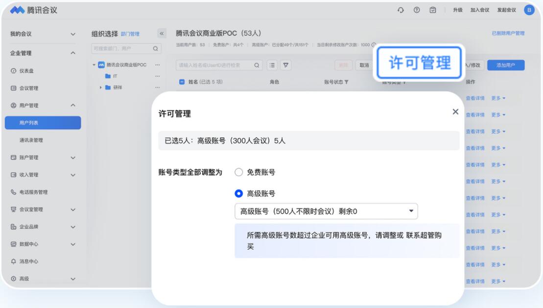 ◎ 批量统一分配:勾选您想要分配资源的所有用户,点击【许可管理】,进行批量处理,实现快速分配。