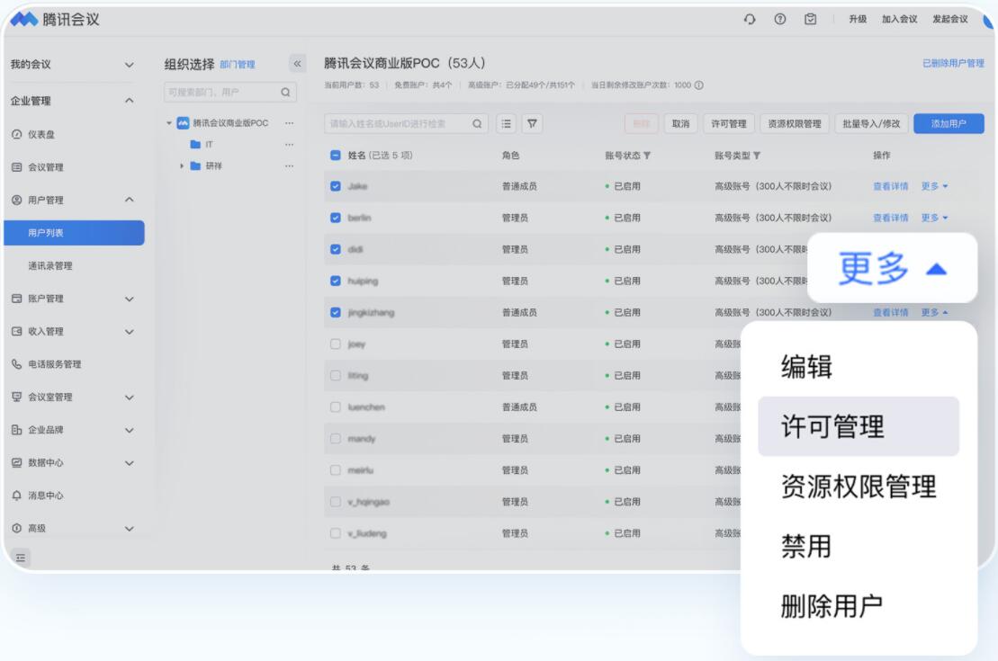 ◎ 单个员工分配:在企业成员列表中找到该用户,点击【更多】-【许可管理】,完成分配。