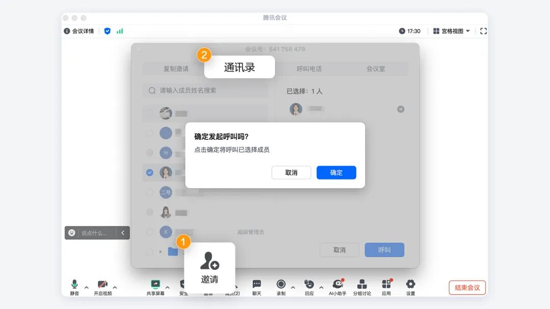 会议开始后,如果有同事还没入会,或者需要拉新人进来讨论时,主持人可以通过组织通讯录发起呼叫,支持响铃提醒,能够迅速喊上相关同事加入会议,再也不怕错过重要沟通啦!