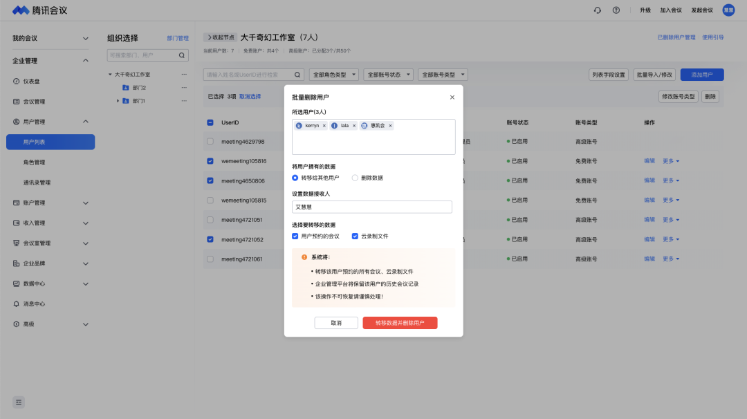 腾讯会议商业版/企业版提供了离职继承管理能力,企业管理员可以在管理后台将离职员工名下的会议资产(云录制、待开会议)进行删除或者直接转移给其他同事,确保离职带不走,新人可继承,让会议资产在企业内部安全地留存、流动。同时,我们还支持批量转移给同一个同事,方便管理员操作。